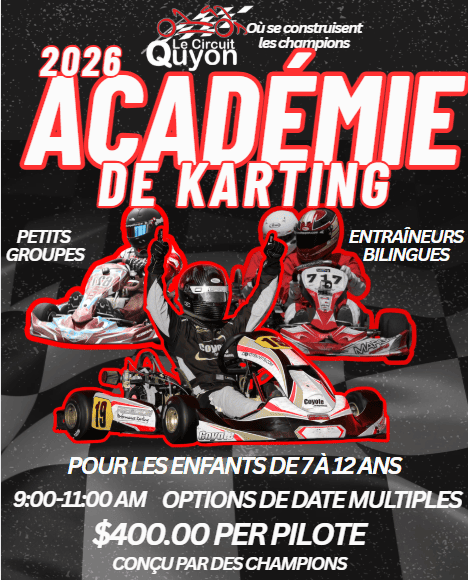 L’Académie de Karting 2026 offre UN programme pour débutants (7 à 12 ans), proposé CINQ fois au cours de l’été.